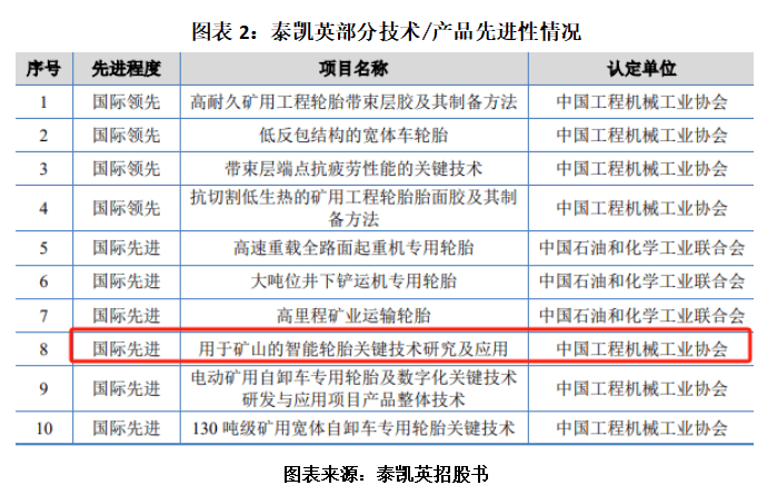 招股书显示,泰凯英“用于矿山的智能轮胎关键技术研究及应用”的技术/产品达到国际先进水平,认定单位为中国工程机械工业协会(下称“中机协”)。