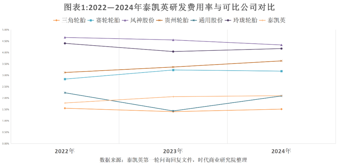 然而,泰凯英研发费用率却不及同行均值。第一轮问询回复文件显示,报告期各期,其研发费用率分别为1.78%、2.06%、2.10%;同期,同行可比公司研发费用率均值分别为3.13%、3.00%、3.15%,远高于泰凯英。从单个企业来看,除了三角轮胎(601163.SH)和通用股份(601500.SH),其他可比公司的研发费用率均持续高于泰凯英。