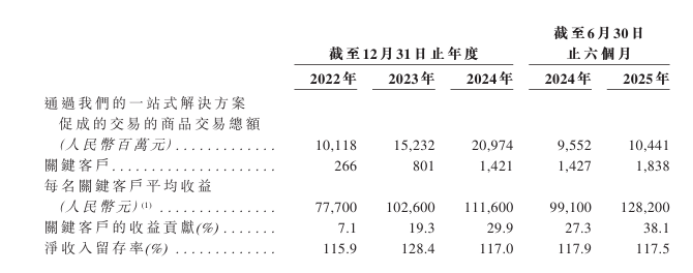 报告期各期,公司拥有关键客户分别为266名、801名、1421名、1838名;每名关键客户的平均收益分别为7.77万、10.26万、11.16万、12.82万,关键客户的收益贡献占比分别为7.1%、19.3%、29.9%、38.1%;净收入留存率分别为115.9%、128.4%、117.0%、117.5%。