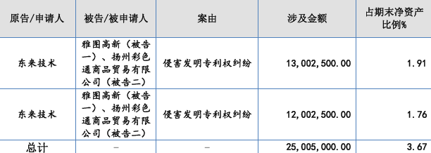 2025年6月30日和2025年8月25日,南京市中级人民法院分别就受理东来技术诉公司侵害发明专利权纠纷案件(案号:(2025)苏01民初1700号和案号:(2025)苏01民初2099号)对雅图高新出具应诉通知书,并向公司发送起诉状及证据副本。