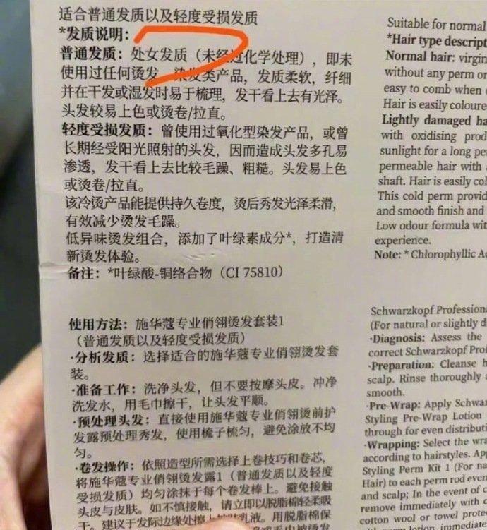 从消费者提供的图片上看,这款产品名为施华蔻俏翎烫发药水,引发争议的地方是包装盒背面的发质说明写着,普通发质:处女发质(未经过化学处理)即未使用过任何烫发、染发类产品,发质柔软,纤细并在干发或湿发时易于梳理。