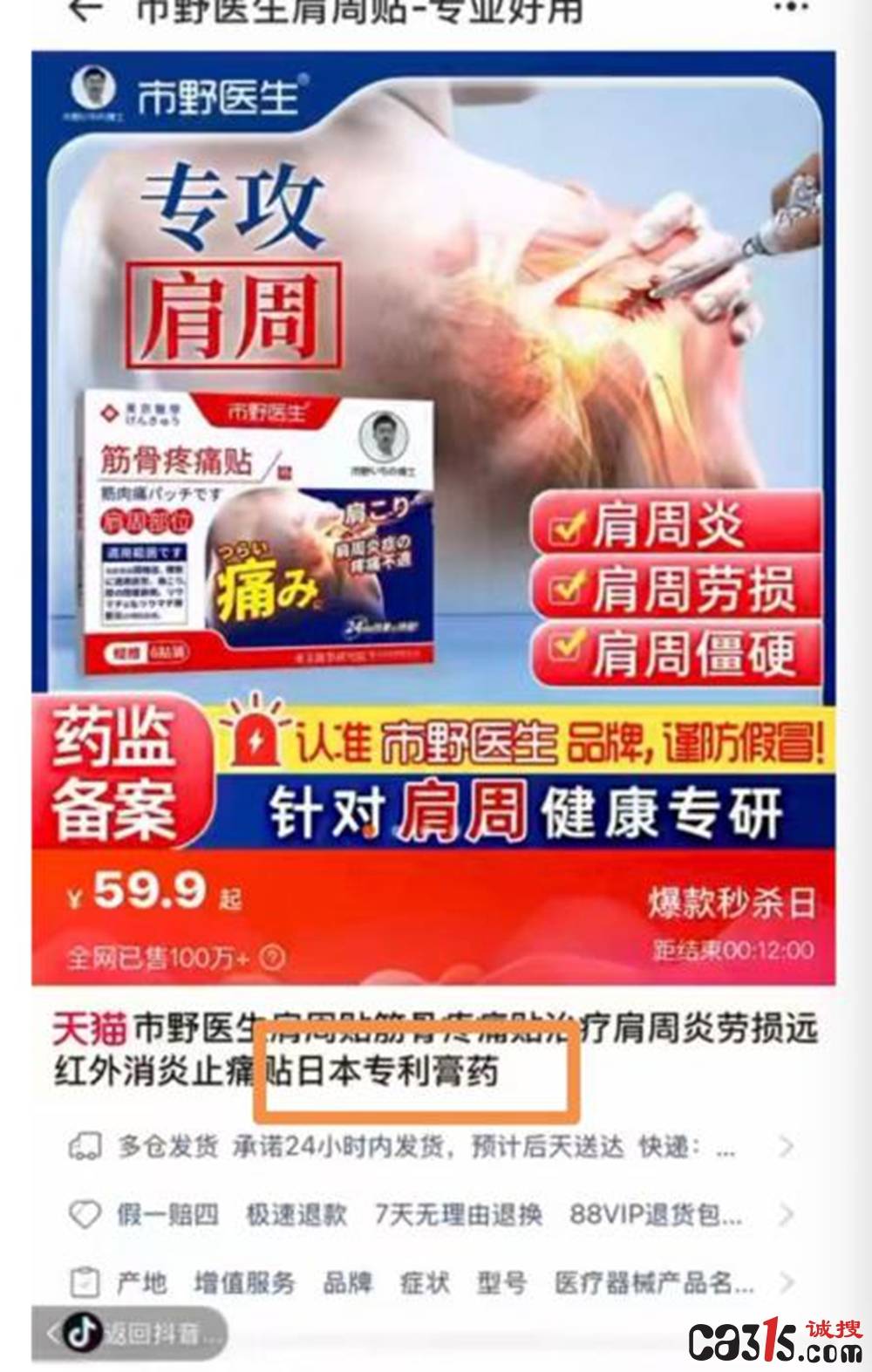 今年7月,市场监管总局公布了一批违法广告典型案例。市野(郑州)网络科技有限公司因在互联网发布“市野医生筋骨疼痛贴”医疗器械广告时,含有“日本引进”“日本国民品牌”等与事实不符的信息,并宣称“一盒让你3年的腰腿疼痛、浑身酸痛消失”等内容,被河南省郑州市市场监管局处以20万元罚款。