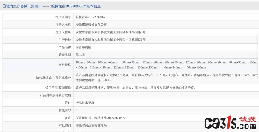 根据国家药监局官网查询,“市野医生”产品实际成分为远红外陶瓷粉、载体胶及高分子聚合物与无纺布等,生产企业为安徽康源药械有限公司。