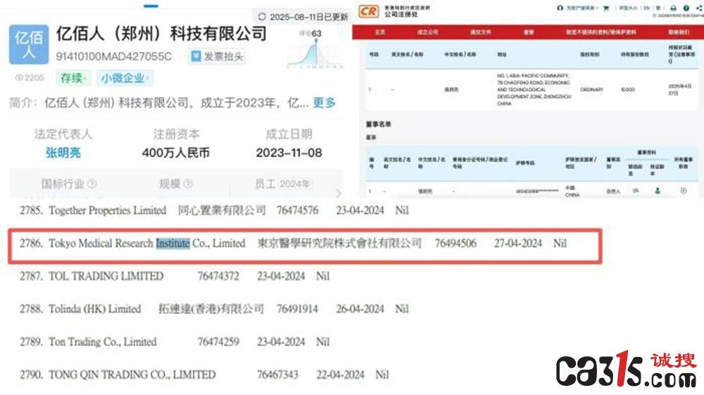 中新网记者调查发现,“市野医生”宣称的“联合东京医学研究院匠心研制”,实则是一家2024年4月27日在香港注册成立的“东京医学研究院株市会社有限公司”,其董事与亿佰人(郑州)科技有限公司法定代表人同名,均为张明亮。