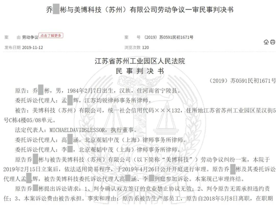美博科技在向乔文彬发出的《竞业限制开始通知书》中已明确将强一股份列为竞争业务单位。乔某彬离职后不仅在该公司工作,还通过股权代持成为其背后投资人,这一行为构成了双重违约,既有违竞业限制义务,也违背了诚实信用原则。强一股份作为乔某彬违约入职的直接竞争对手,同时又是其投资对象,成为本案中关键的事实关联方。法院的判决不仅认定了乔某彬违反竞业限制义务的事实,也间接回应了其试图通过股权代持隐匿与竞争企业之间利益关联的行为。