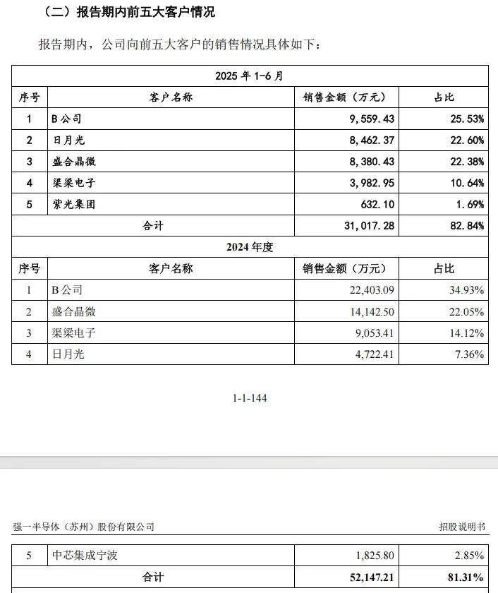 近年来,强一股份在业务快速扩张的同时,也显露出对单一客户B公司的深度依赖及其带来的毛利率异常波动问题,引发监管机构高度关注。2022年至2024年,公司营业收入从2.54亿元增长至6.41亿元,而同期对前五大客户的销售占比却持续攀升,从62.28%升至81.32%,集中度显著偏高。尤其值得注意的是,若将B公司及其供应链中的相关测试服务商视为一个整体,2022年至2025年上半年,强一股份来自于B公司及已知为其芯片提供测试服务的收入分别为 1.28亿元、2.39亿元、5.25亿元和 3.10亿元,占营业收入的比例分别为50.29%、67.47%、81.84%和 82.83%,显示出对B公司极强的业务依附性。