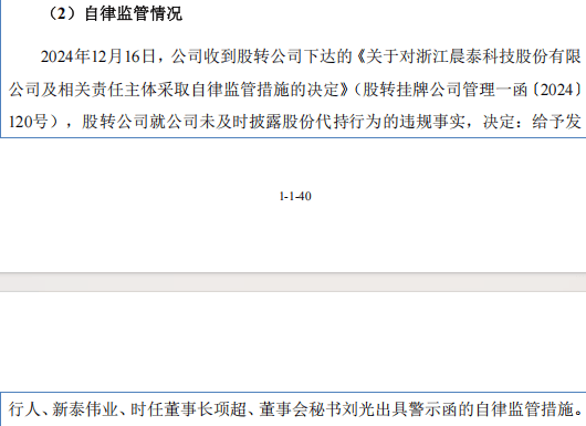 2016年1月,公司控股股东新泰伟业由第三方代为持有晨泰科技1730万股,占总股本比例超过20%,但公司直到2024年9月才补充披露这一信息。