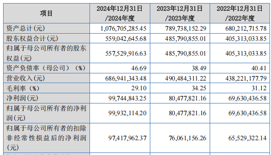从表面财务数据看,晨泰科技报告期内(2022-2024年)的业绩呈现增长态势:营收分别为4.38亿元、4.90亿元和6.87亿元。