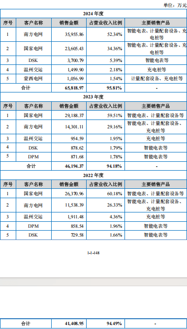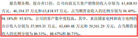 晨泰科技的业务高度依赖“两网”(国家电网和南方电网)。报告期内,公司向前五大客户销售的收入占比分别为94.49%、94.18%和95.81%。