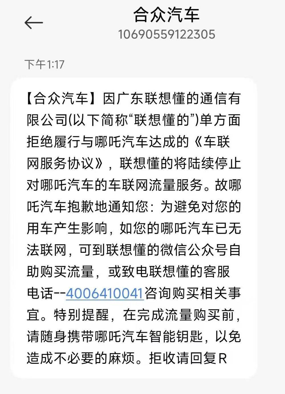 合众汽车表示,因广东联想懂的通信有限公司单方面拒绝履行与哪吒汽车达成的《车联网服务协议》,联想懂的将陆续停止对哪吒汽车的车联网流量服务。因此,哪吒汽车通知车主:为避免对用车产生影响,如哪吒汽车已无法联网,可到联想懂的微信公众号自助购买流量,或致电联想懂的客服电话咨询购买相关事宜。