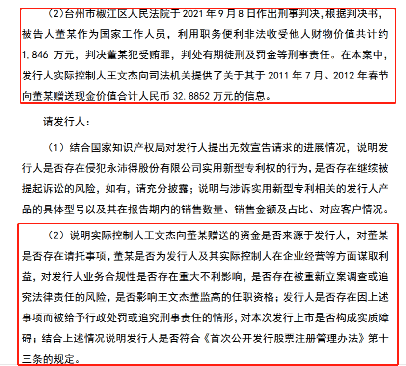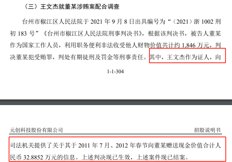 更令人担忧的是实际控制人王文杰的法律风险。2021年台州市椒江区人民法院的刑事判决书显示,王文杰曾于2011年7月和2012年春节,向原台州市人大常委会秘书长董某赠送现金合计32.88万元。