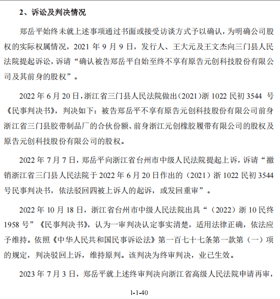元创股份历史上还曾发生重大股权纠纷。王文杰前姐夫郑岳平因股权确认问题与公司对簿公堂,该纠纷历经一审、二审及再审程序,耗时两年才最终解决。