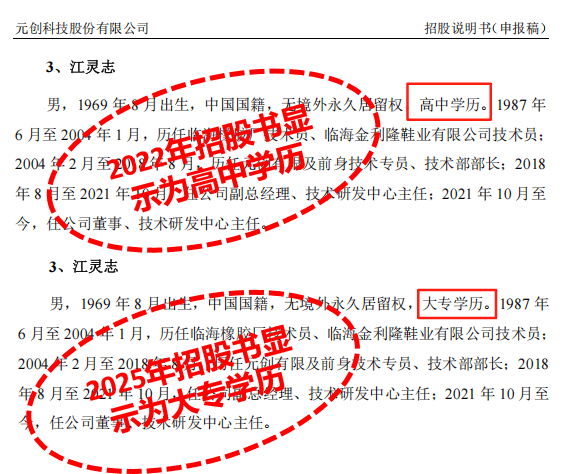 核心技术人员的学历"变脸"更显蹊跷。董事兼研发主任江灵志从高中"逆袭"为大专,技术研发中心副主任徐贤坤从中专跃升大专,王文杰本人也从本科进阶为硕士。