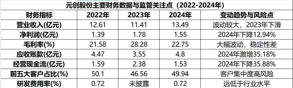 最新财报数据表面稳定,实则暗藏风险。2022-2024年,公司营收分别为12.61亿、11.41亿、13.49亿,净利润分别为1.39亿、1.78亿、1.55亿。