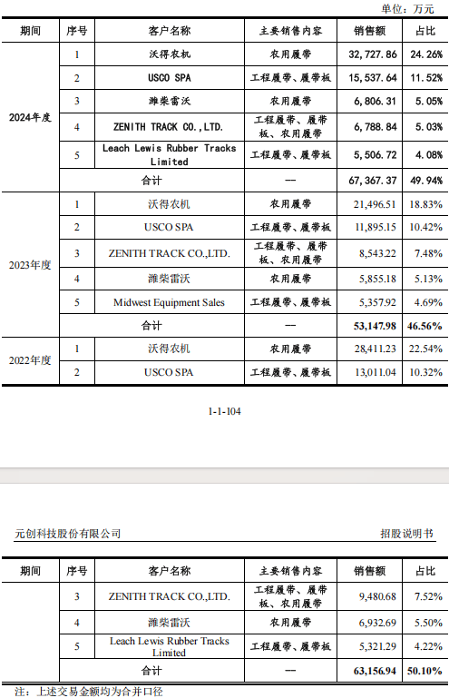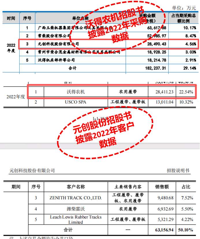 元创股份的招股书披露的客户数据与客户自身披露存在矛盾。沃得农机招股书显示,2022年向元创采购金额为2.85亿元,但元创科技自称对该客户销售额为2.84亿元,相差近79万元。