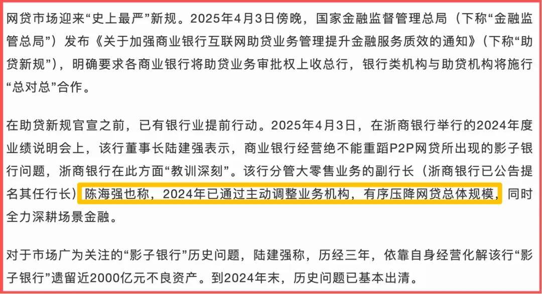 2025年4月3日,在浙商银行举行的2024年度业绩说明会,时任浙商银行董事长陆建强(已于2025年7月9日辞职)表示,商业银行经营绝不能重蹈P2P网贷所出现的影子银行问题,浙商银行在此方面“教训深刻”。