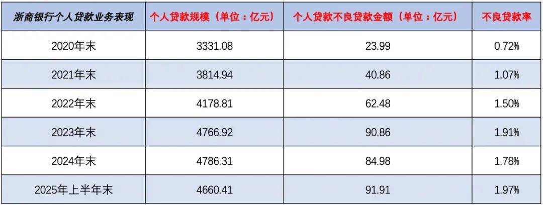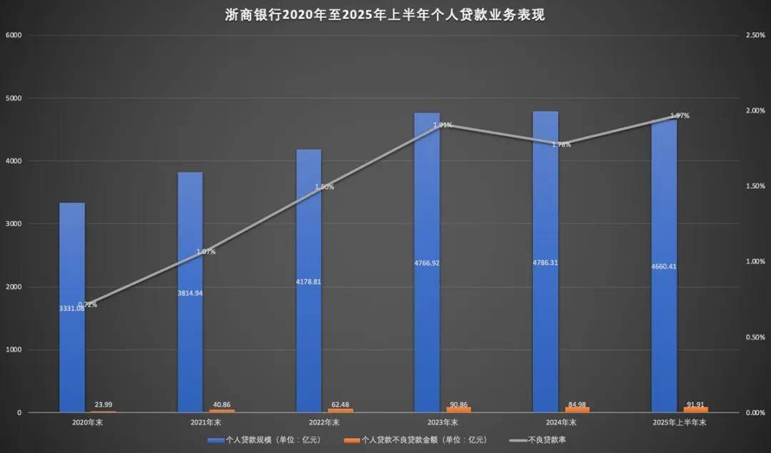另据浙商银行2025年半年度报告,浙商银行个人贷款的不良贷款规模再次增长。截至2025年上半年末,该行的个人贷款金额约为4660.41亿元。其中,不良贷款金额约为91.91亿元,比2024年末的84.98亿元增加6.93亿元,续创新高。