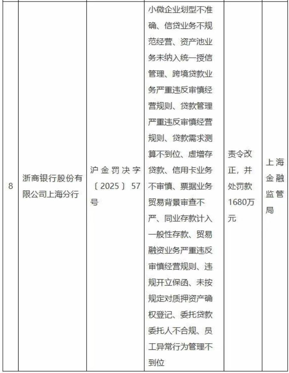 值得一提的是,这已是浙商银行2025年以来收到的第二张千万元级别罚单。今年1月,上海金融监管局亦曾向浙商银行上海分行开出一张1680万元的巨额罚单,涉及虚增存贷款、信用卡业务不审慎15项违规行为。