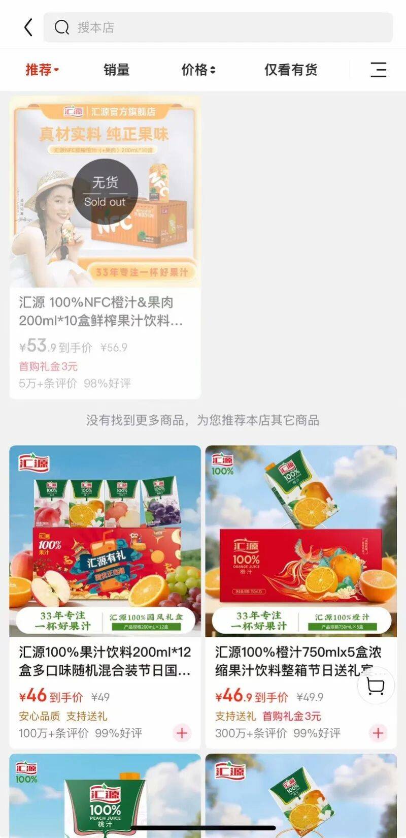 针对声明中提到的“目前各大电商平台出现大面积断货”的情况,南都湾财社记者留意到,目前电商平台上的汇源店铺确实有部分产品显示无货状态。比如在汇源京东自营旗舰店上,其NFC鲜榨果汁系列全部断货。