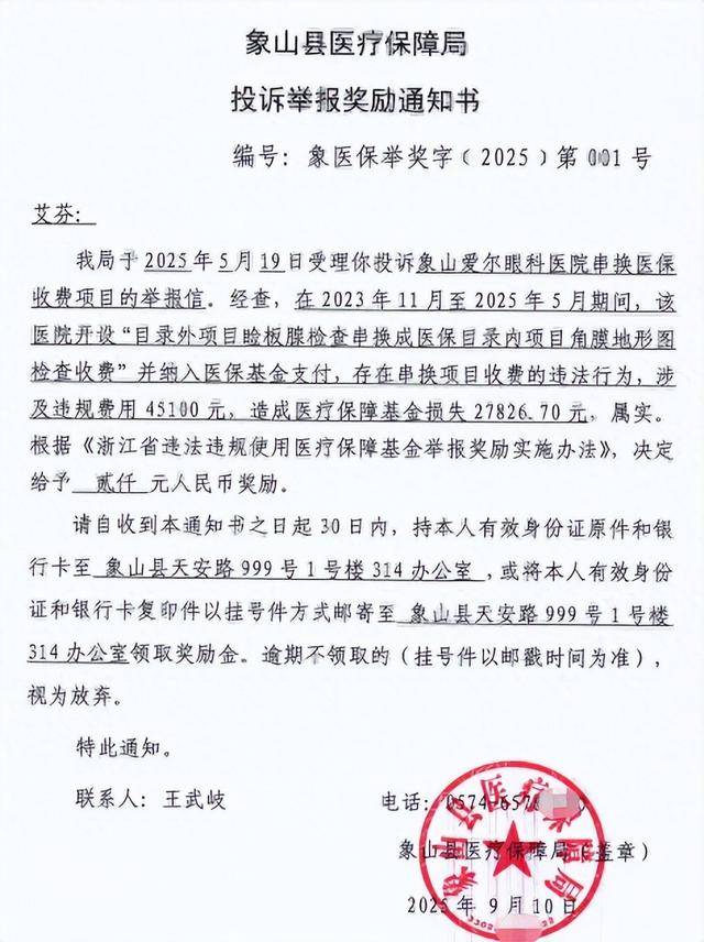 《象山县医疗保障局投诉举报奖励通知书》显示,该局于2025年5月19日受理艾芬投诉象山爱尔眼科医院串换医保收费项目的举报信。经查,在2023年11月至2025年5月期间,该医院开设“目录外项目睑板腺检查串换成医保目录内项目角膜地形图检查收费”并纳入医保基金支付,存在串换项目收费的违法行为,涉及违规费用45100元,造成医疗保障基金损失27826.70元,属实。根据浙江省相关办法,决定给予2000元人民币奖励。
