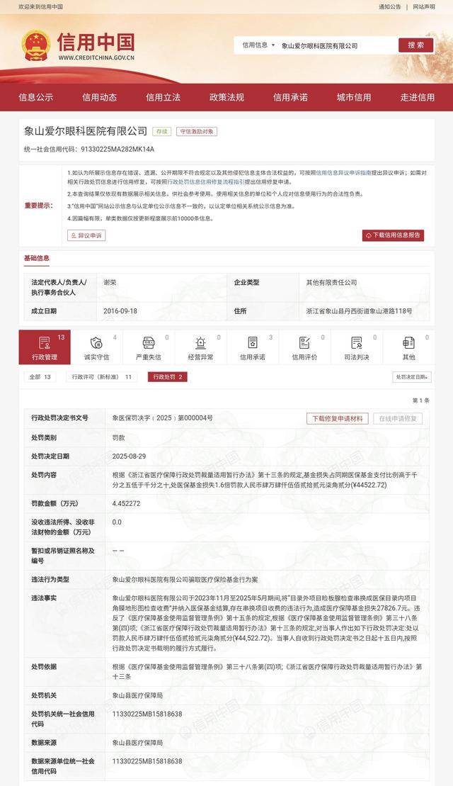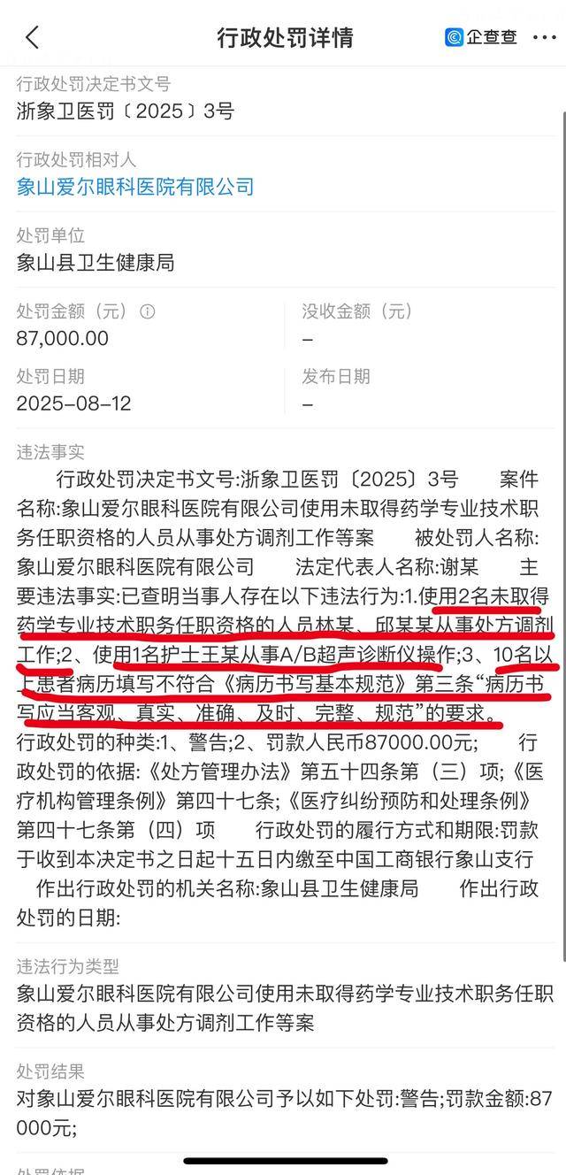 记者获取的象山县医疗保障局行政处罚信息中,明确象山爱尔眼科医院有限公司存在骗取医疗保险基金行为,对医院作出罚款44522.72的处罚决定。同时,该医院因使用未取得药学专业技术职务任职资格的人员从事处方调剂工作等违规行为,被象山县卫生健康局罚款87000元。