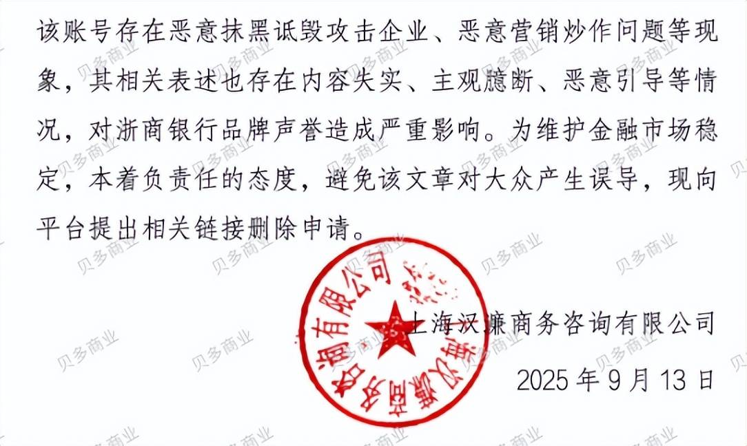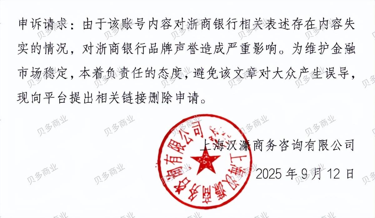 9月11日、12日,贝多商业&贝多财经发布了相关解读文章,但遭到了名义为浙商银行,但落款为“上海汉濂商务咨询有限公司”的多次投诉。对方称,稿件表述中“(个人贷款的不良贷款金额)四年实现了几何倍的增长”,表述不实。