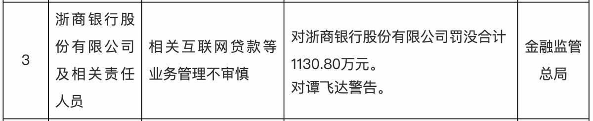 2025年9月5日,国家金融监督管理总局披露的行政处罚信息公示列表显示,浙商银行、华夏银行均收到大额罚单。其中,浙商银行因相关互联网贷款等业务管理不审慎被罚没合计1130.80万元。