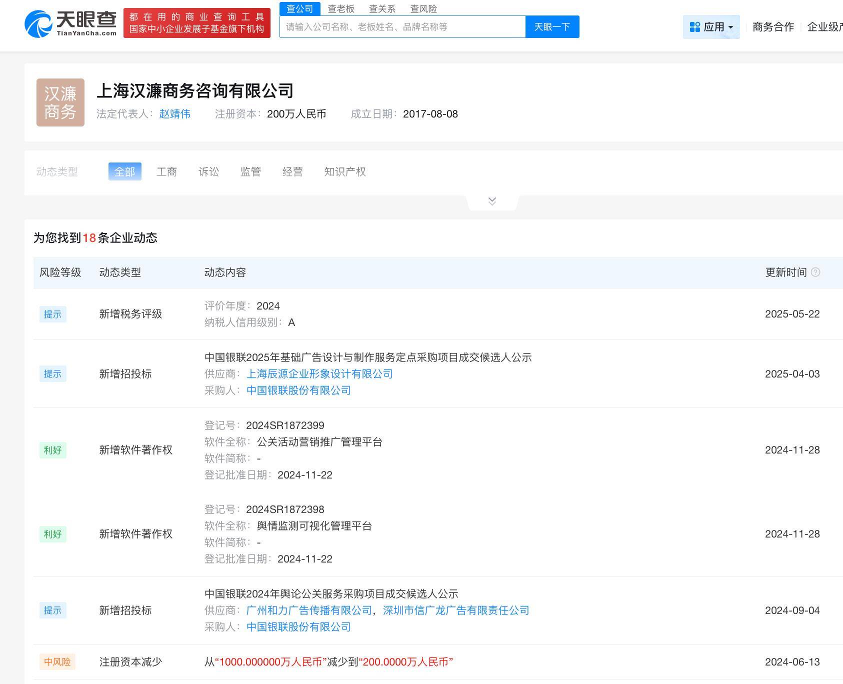 而从相关招标信息来看,上海汉濂商务咨询有限公司曾作为参审供应商参与竞标“中国银联2025年基础广告设计与制作服务定点采购项目”和“中国银联2024年舆论公关服务采购项目”等,但均未中标。