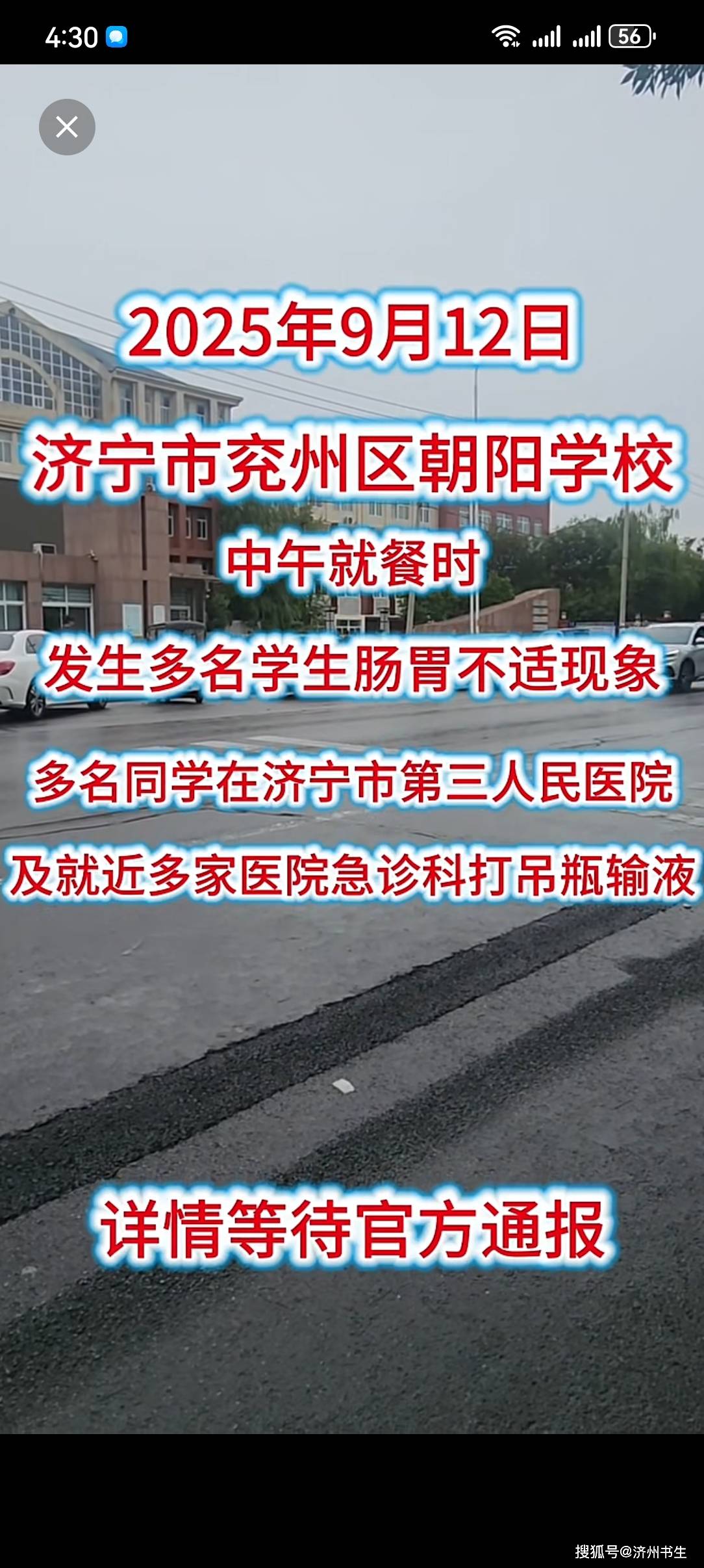 2025年9月12日,济宁市兖州朝阳学校中午就餐时发生多名学生肠胃不适现象,下午多名同学在就近济宁市第三人民医院及其他多家医院急诊科打吊瓶输液就医。具体引发同学们在校就餐肠胃不适的原因尚不明确,需等待有关部门的通报。