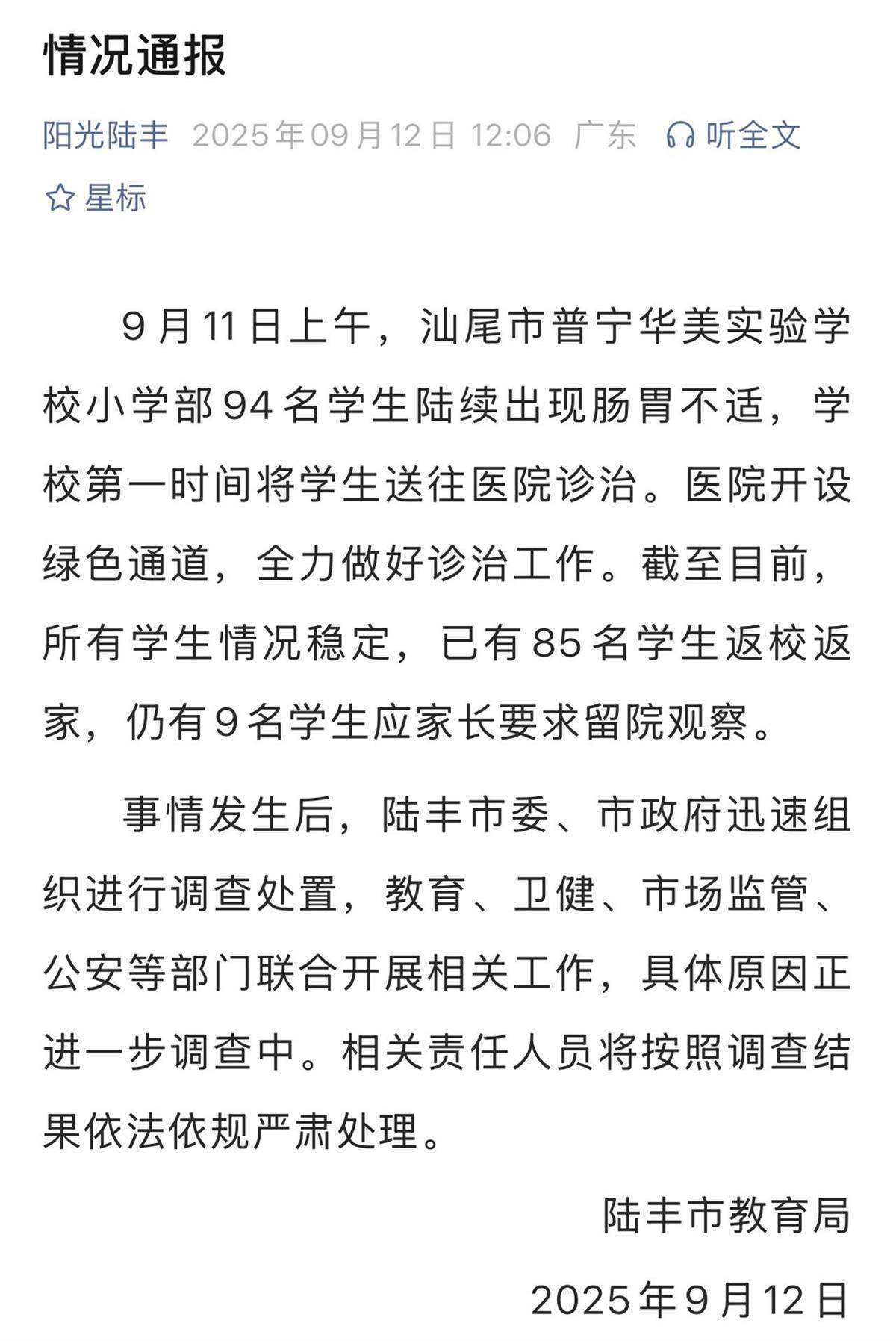 陆丰市教育局随后发布情况通报称,9月11日上午,汕尾市普宁华美实验学校小学部94名学生陆续出现肠胃不适,学校第一时间将学生送往医院诊治。医院开设绿色通道,全力做好诊治工作。