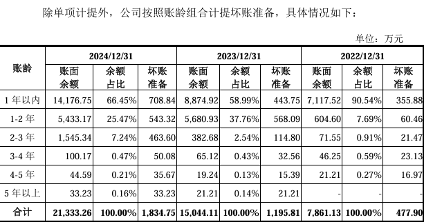 截至报告期末,易加增材一年以上账龄的应收账款余额为7496.99万元,占比34.59%,部分长账龄款项未能完全收回。