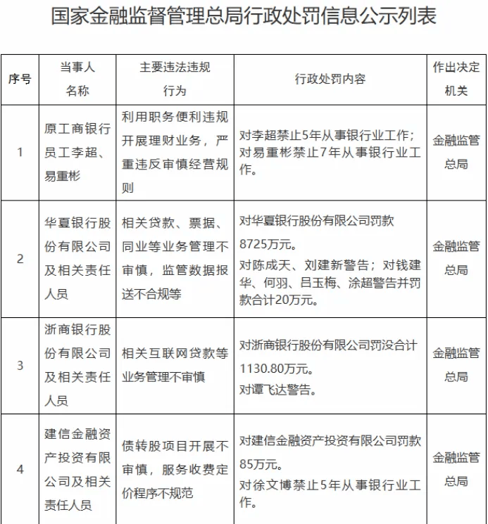 9月5日,国家金融监管总局披露多条行政处罚信息,涉及华夏银行(600015.SH)、浙商银行(601916.SH)、建信投资以及原工商银行(601398.SH;01398.HK)两名员工。