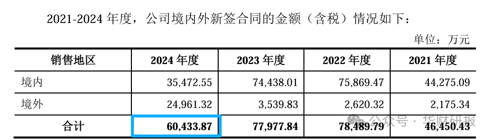 无论2024年新签合同总金额哪个才是真实数据,顶立科技销售区域确实发生了显著变化。2023年,公司来自境内和境外的新签合同金额分别为7.44亿元、3539.83万元,而2024年境内新签合同金额几乎“腰斩”(上图),仅为3亿多元,境外新签合同金额则暴增近7倍达到2亿多元。