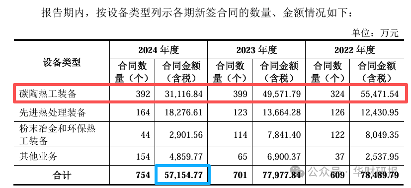 报告期内,碳陶热工装备占据公司主营业务收入七成左右,2024年该设备新签合同数量为392个,虽然仅比2023年减少7个,但合同金额却减少了1.85亿元(下图)。