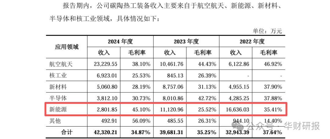 根据问询回复披露,造成公司2024年业绩涨势戛然而止的主要原因是下游新能源行业遇冷。2024年光伏产业的供需极度失衡已是有目共睹,今年各方更是持续敦促光伏产业链企业进行减产。反映在顶立科技账面上的是,碳陶热工设备在新能源领域的收入持续减少,报告期内分别为16636.03万元、11120.96万元、2801.85万元(下图),2024年比上年减少了74.81%。
