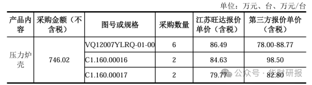 以江苏旺达特种设备制造有限公司(以下简称“江苏旺达”)为例,2023 年,控股股东及其关联方向江苏旺达采购金额为449.56万元,顶立科技向江苏旺达采购金额为806.40万元。顶立科技向其采购的压力炉壳,三个型号的采购价格中只有一个处于第三方报价区间,另两个型号的每台采购单价分别低于第三方报价13.87万元和3.03万元(下图)。