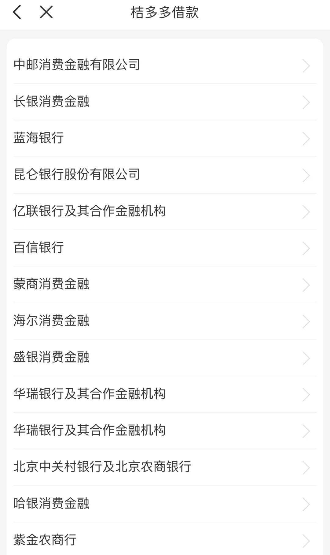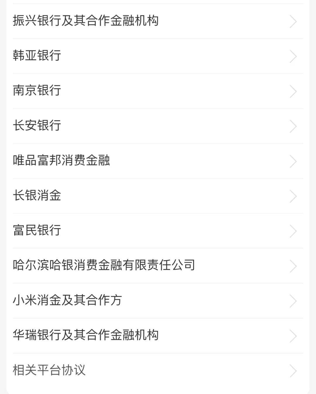 桔多多提供的“借款相关协议”显示,其合作机构目前包括中邮消费金融、长银消费金融、蓝海银行、昆仑银行、亿联银行、百信银行、蒙商消费金融、海尔消费金融、盛银消费金融、华瑞银行、北京中关村银行、北京农商行、哈银消费金融、紫金农商行、振兴银行、南京银行、韩亚银行、长安银行、唯品富邦消费金融、富民银行、小米消金等20余家。
