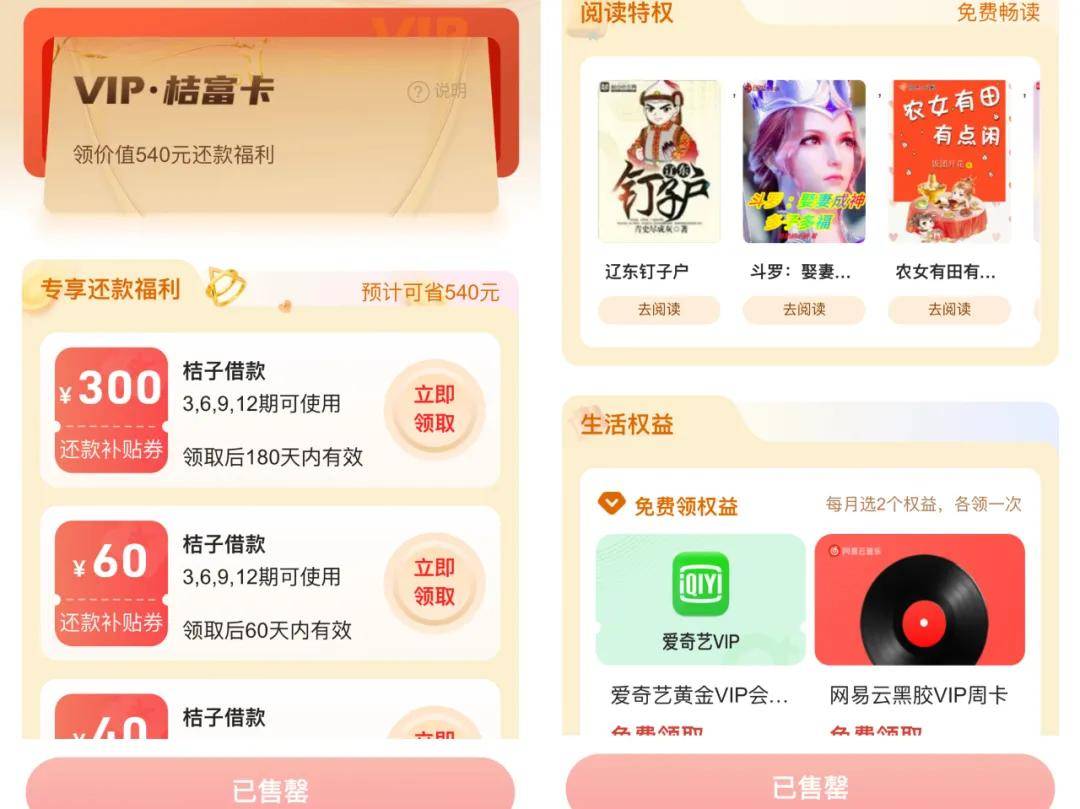 除借款服务外,桔多多还为用户提供“桔富卡”会员专享福利,包括专享还款福利的“还款补贴券”,以及“阅读特权”和“生活权益”等,目前桔富卡购买状态显示“已售罄”。