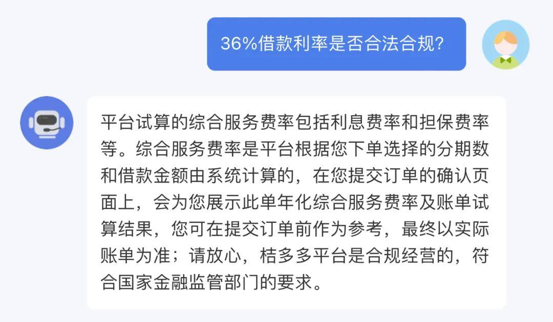 在关于“36%借款利率是否合法合规”的问题上,桔多多官方客服给出的回复是:“平台试算的综合服务费率包括利息费和担保费率等……桔多多平台是合规经营的,符合国家金融监管部门的要求。”