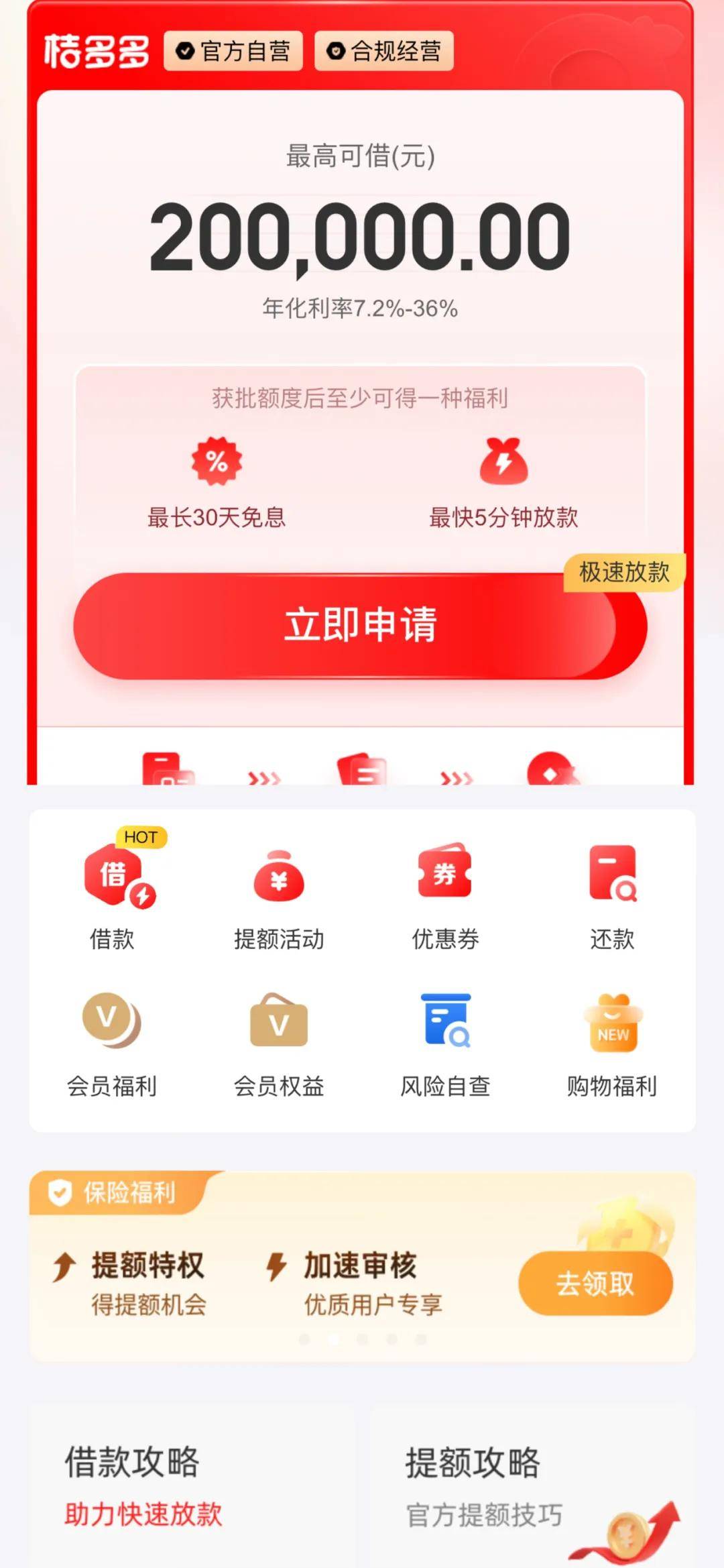以利率上限36%的桔多多为例,其APP介绍最高可借金额为20万元,年化利率为7.2%-36%,最长30天免息,最快5分钟放款。