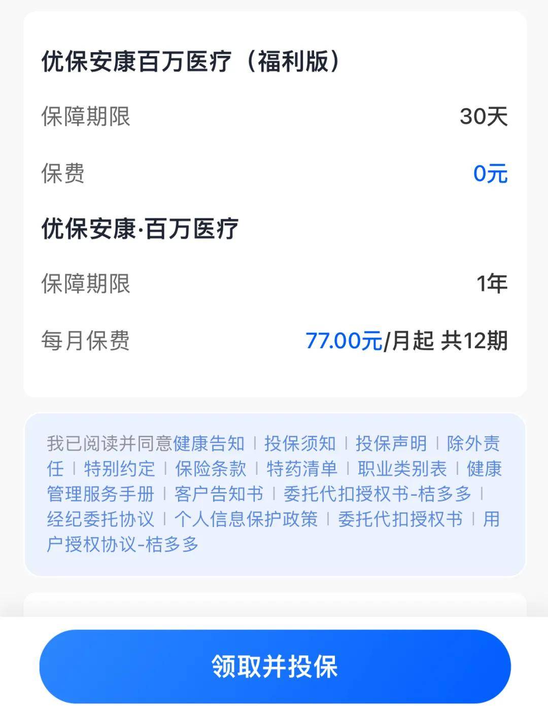 为了让更多用户享受到提额特权和加速审核,桔多多还推出了保险服务,其中福利版保障期限为30天,保费为0元;到期后续费金额为77元/月起,共12期,每年保费约为924元。