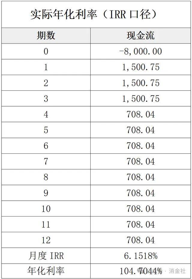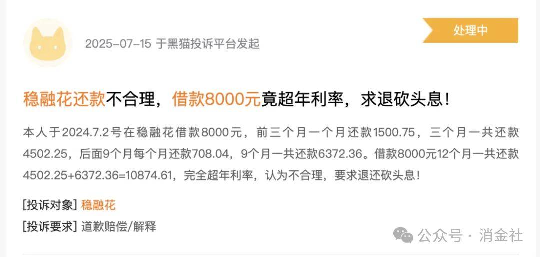 “稳融花”的高息问题更为突出,7月15日的一条投诉显示,有用户于2024年7月2日在“稳融花”借款8000元,前三个月一个月还款1500.75,后面9个月每个月还款708.04。借款8000元12个月一共还款10874.61。有媒体计算后发现,该笔借款的年化IRR高达105%。