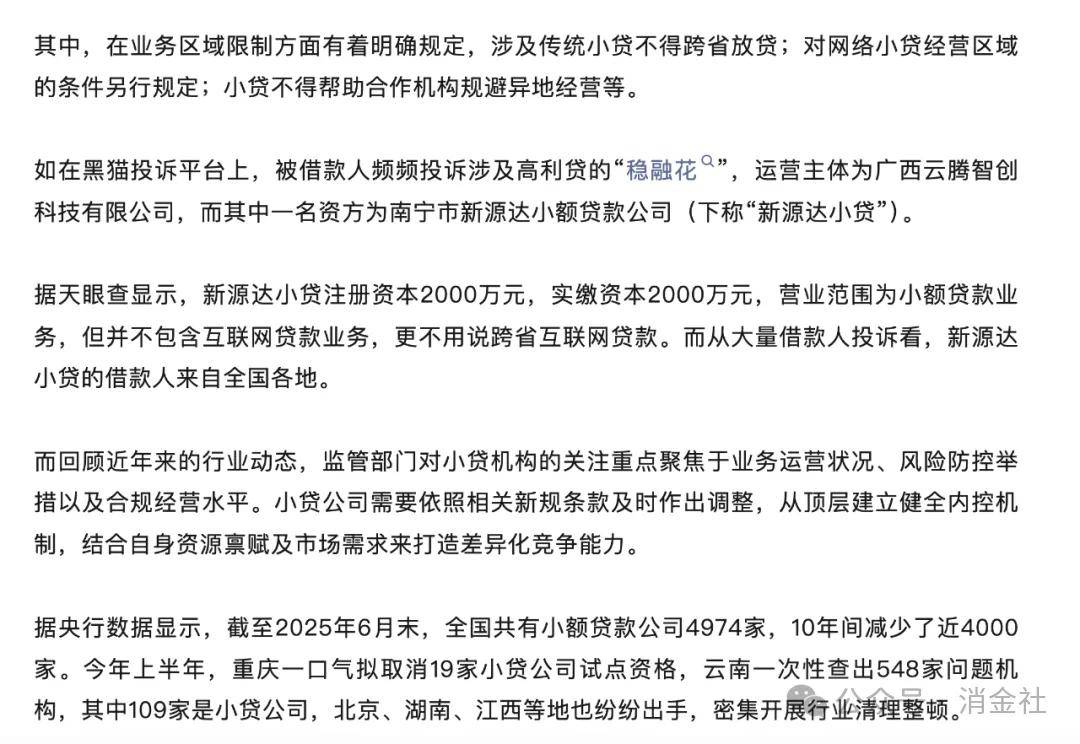 综合多条用户投诉显示,“稳融花”的运营主体为广西云腾智创科技有限公司,资方为南宁市新源达小额贷款公司、山西信托股份有限公司等。