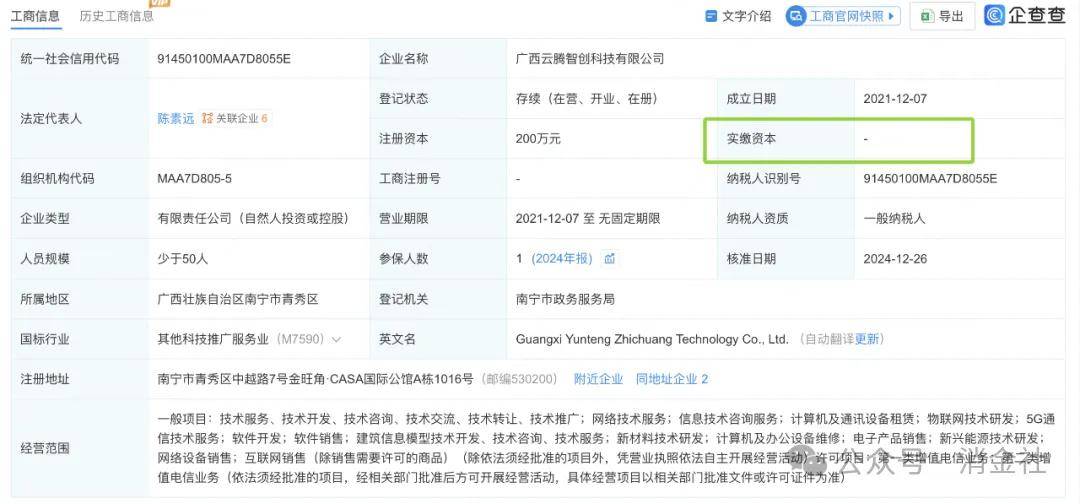 企查查显示,广西云腾智创科技有限公司(下称“广西云腾”)成立于2021年,法定代表人及实际控制人均为陈素远。公司注册资本200万元,实缴资本为0,股东为陈素远和杨绍欢,2024年员工人数为1。公司经营范围中并不包含金融类相关服务。