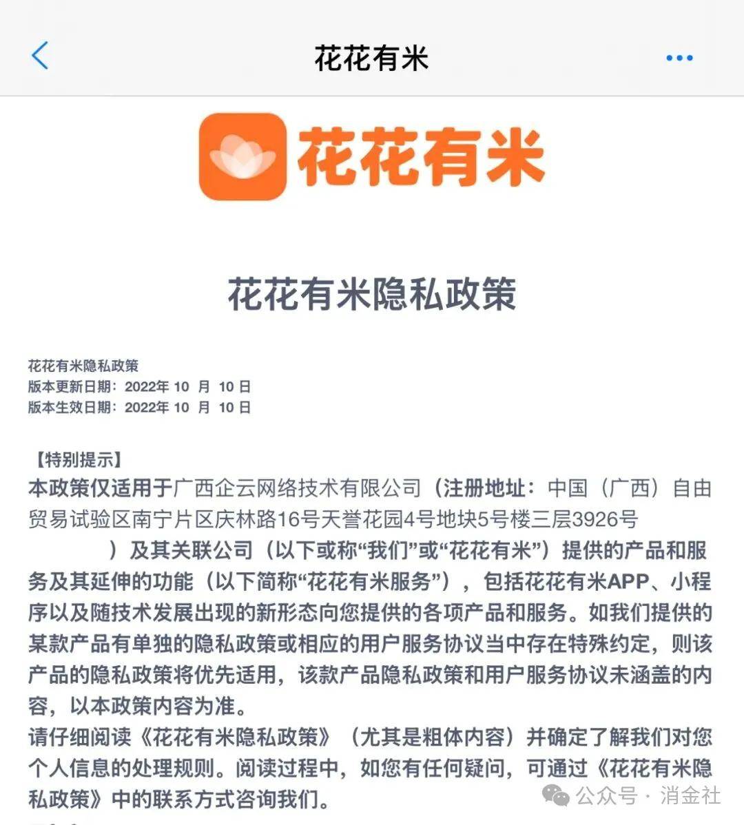 广西花花有米米钱包科技有限公司拥有场景消费分期产品“安稳借”软著,备案了“百灵办单”小程序。