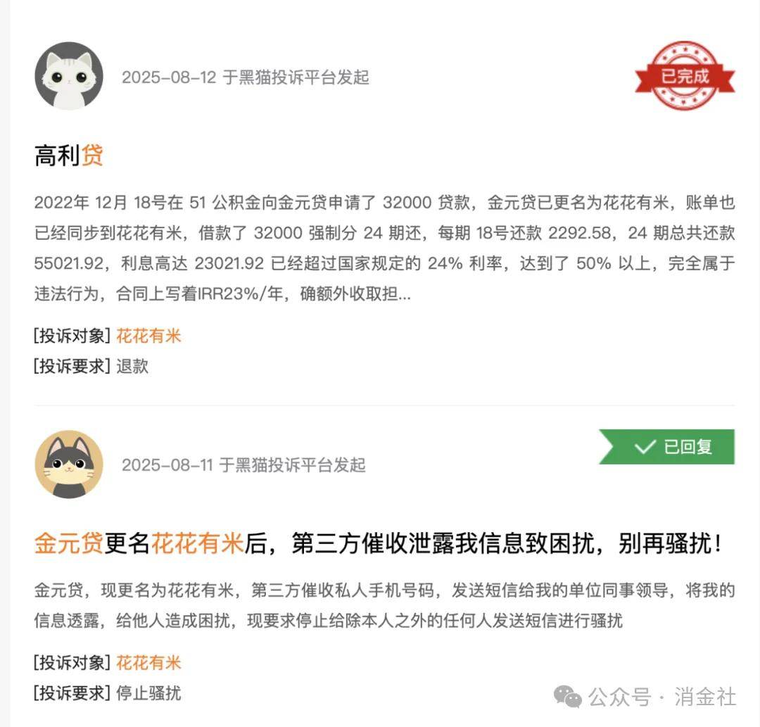 此外,综合用户投诉及《开甲财经》、《九州商业观察》等媒体报道,“花花有米”曾命名为“手机借钱”、“金元贷”。51公积金平台曾为“金元贷”导流,相关投诉显示“金元贷”IRR年化利率达77%,如今换壳为“花花有米”后利率仍维持在80%-100%区间,与“盈盈有钱”的模式高度吻合。