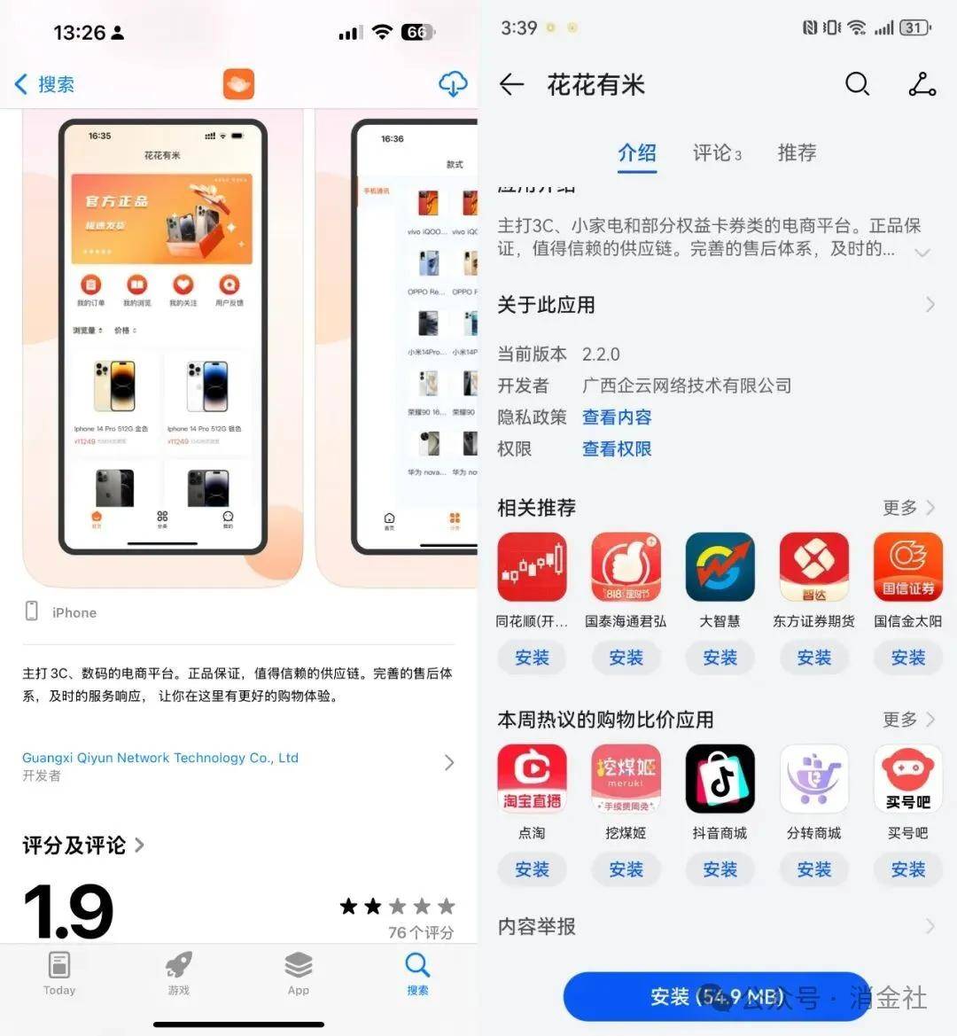 据《开甲财经》近期报道,“南宁小苔网络科技有限公司注册了米米钱包,其对应的借贷产品为‘花花有米’。”然而,华为应用商店和苹果 APP Store 均显示,“花花有米”的上架主体为——广西企云网络技术有限公司。