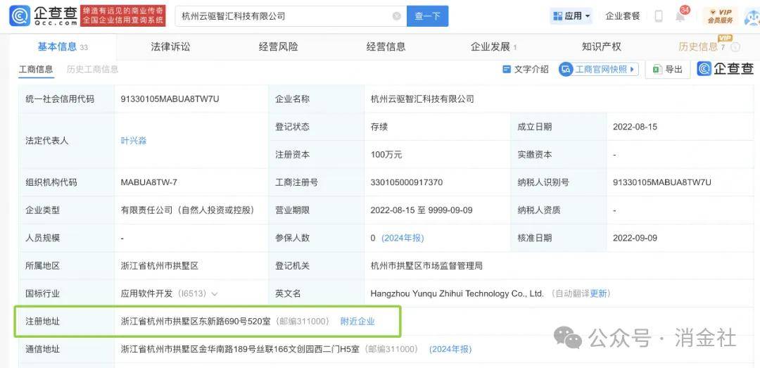企查查显示:杭州云驱智汇科技有限公司(下称“杭州云驱智汇”)成立于2022年,注册资本100万元,实缴资本为0,参保人数为0,公司法人为叶兴淼,股东为叶兴淼和杨绍欢。