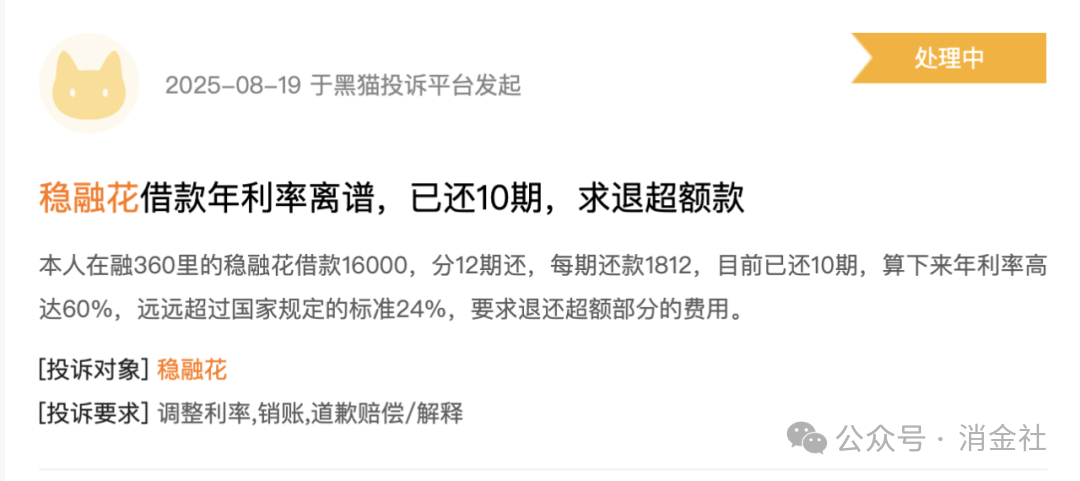 8月19日,有借款人在平台投诉称,“稳融花”借款16000,分12期还,每期还款1812,目前已还10期,算下来年利率高达60%,要求退还超额部分的费用。