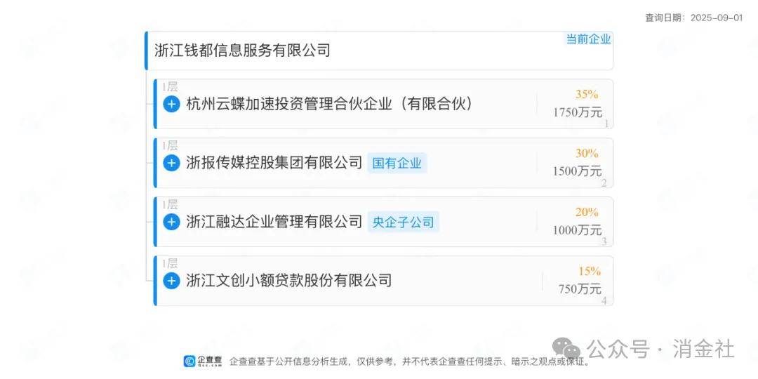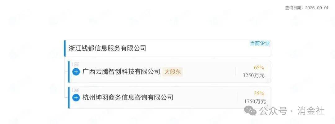 股权穿透后发现,“广西云腾”为浙江钱都信息服务有限公司的大股东(持股65%),后者前身为P2P平台“钱都金服”,该公司成立于2016年11月,并已于2025年5月29日注销(注销原因:决议解散)。
